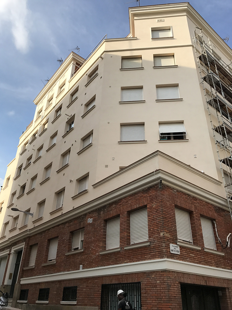 Actuación sobre el 100% de la fachada mediante morteros de cal y aplicando pinturas de silicato. También se ejecutan cambios en los dinteles de las ventanas.